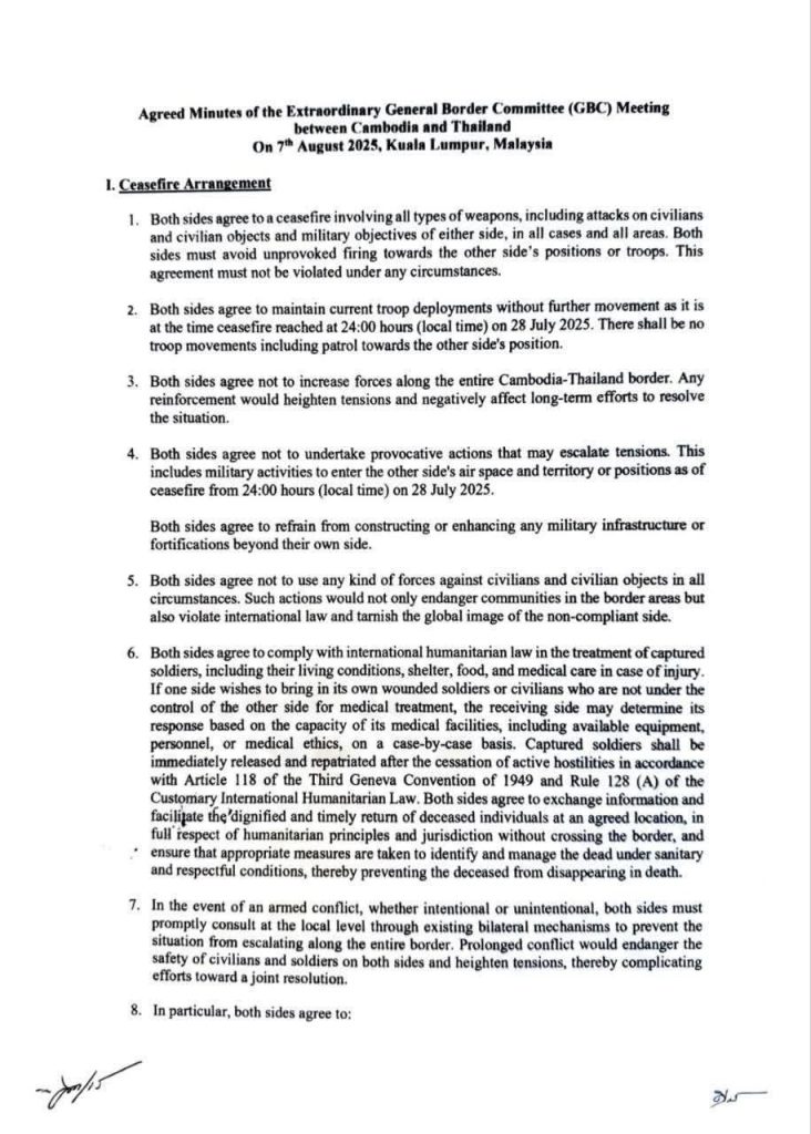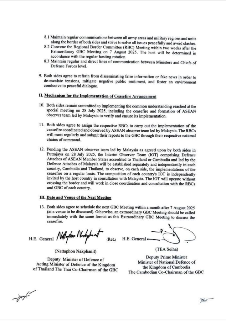 - ယခင်သဘောတူညီချက်များအား အကောင်အထည်ဖော်ခြင်း- နှစ်ဖက်စလုံးသည် အပစ်အခတ်ရပ်စဲရေးနှင့် မလေးရှား (Malaysia) နိုင်ငံမှ ဦးဆောင်သော အာဆီယံ (ASEAN) အဖွဲ့ဝင်နိုင်ငံများ၏ စောင့်ကြည့်လေ့လာရေးအဖွဲ့တစ်ဖွဲ့ ချထားရေးတို့ ပါဝင်သည့် ၂၀၂၅ ခုနှစ်၊ ဇူလိုင်လ ၂၈ ရက်နေ့ ဆွေးနွေးပွဲများမှ သဘောတူညီချက်များကို အကောင်အထည်ဖော်ရမည်။