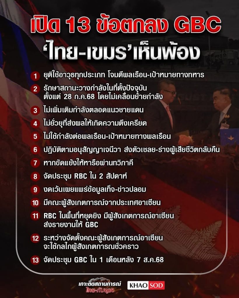 ထိုင်း (Thailand) နိုင်ငံနှင့် ကမ္ဘောဒီးယား (Cambodia) နိုင်ငံတို့အကြား ကျင်းပခဲ့သော အထွေထွေနယ်နိမိတ်ကော်မတီ (General Border Committee – GBC) ၏ အထူးအစည်းအဝေးသည် ပြီးဆုံးသွားခဲ့ပြီး နိုင်ငံနှစ်ခုလုံးက အချက် (၁၃) ချက်ပါ အပစ်အခတ်ရပ်စဲရေး သဘောတူညီချက်ကို သဘောတူညီခဲ့ကြသည်။
